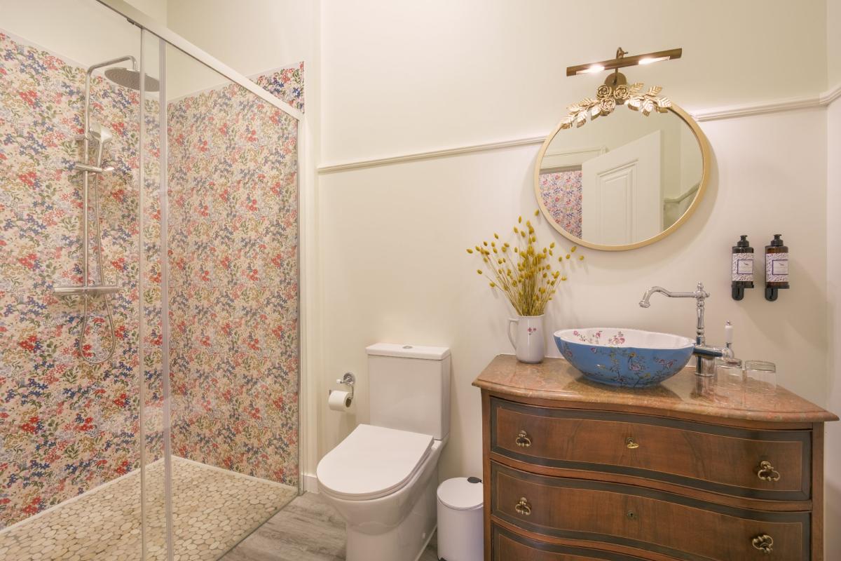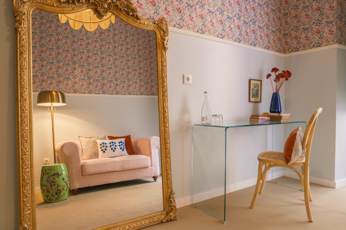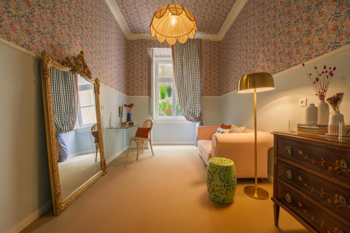 The light blue walls reinforce a serene and relaxing atmosphere, while the details on the pillows embroidered with blue floral motifs bring a touch of delicacy and personalization. The use of soft materials and traditional patterns, such as checks and embroidery, brings to mind a country style, but still sophisticated. The presence of a separate living room and the view of the internal courtyard complete the feeling of privacy and calm. The room is ideal for relaxing in a private and welcoming space, away from the noise of the city, providing a peaceful retreat with a classic and traditional feel.